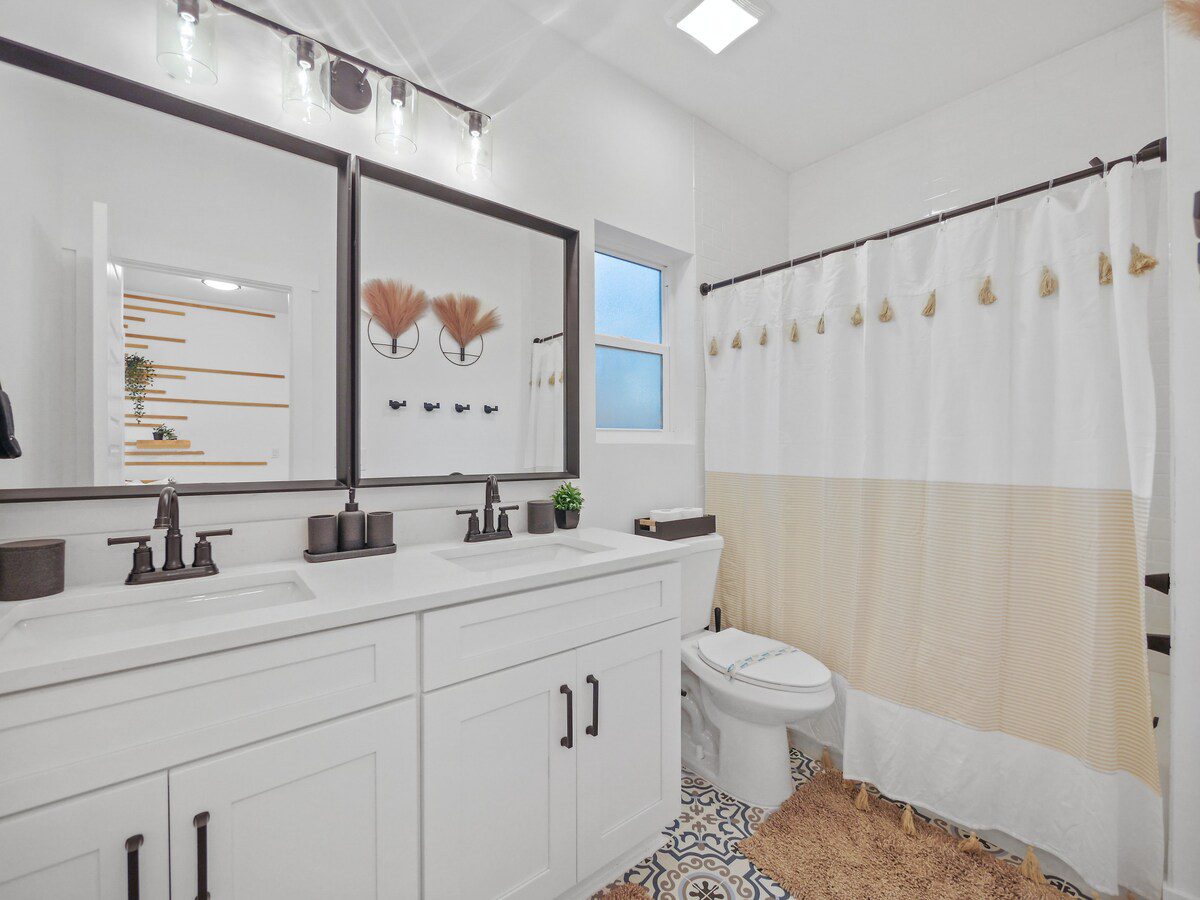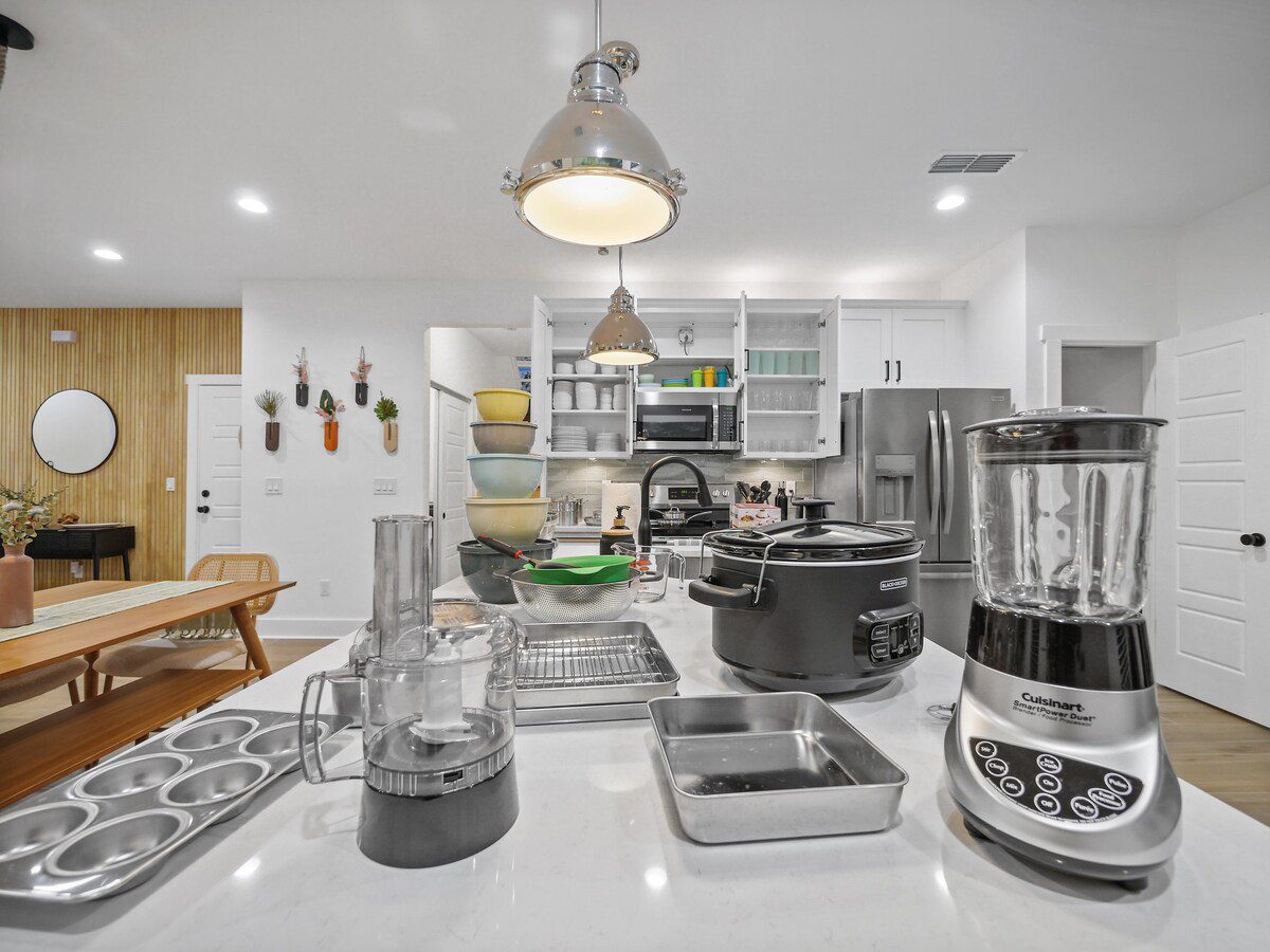 🛏️ Evenings wind down in comfort. Four serene bedrooms (plus two pull-outs) welcome up to 12 guests with blackout curtains, luxurious bedding, and ceiling fans controlled right from your bed. Whether you’re here with family, friends, or your four-legged travel buddy — yes, dogs are welcome and even get their own wash station and treats — everyone has a space to unwind.