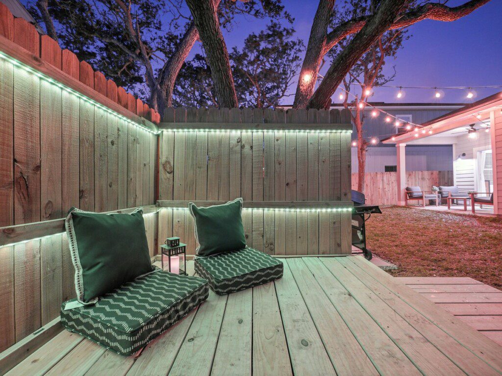 🌅 Backyard entertainment space — outdoor seating, cowboy pool + deck, string lights & LED ambience system