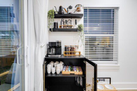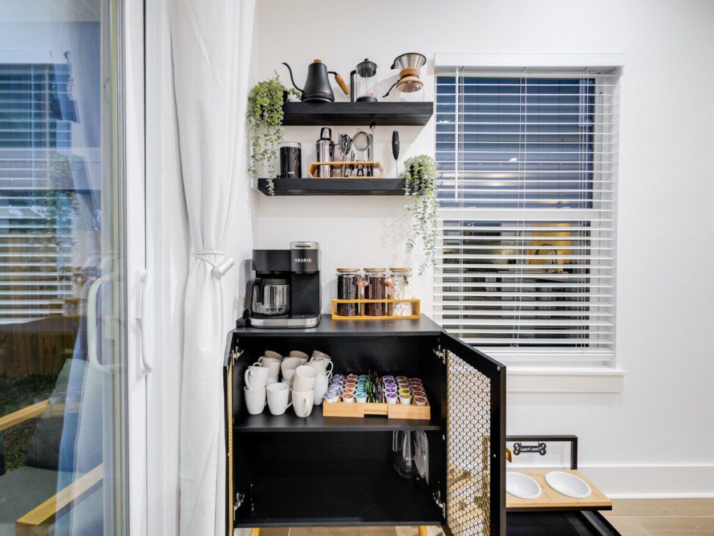 ☀️ Mornings begin slowly. Coffee in hand, you wander into the open-concept kitchen, sunlight spilling across the 9-foot ceilings and stylish décor. The full coffee and tea bar waits for you — beans, creamers, sugars, teas — all ready for your perfect start. Maybe you’ll take your mug out back, where string lights drape across the patio and the LED cowboy pool shimmers invitingly. In summer, it’s a refreshing plunge; in winter, an ice-cold wake-up call that leaves you laughing and alive.